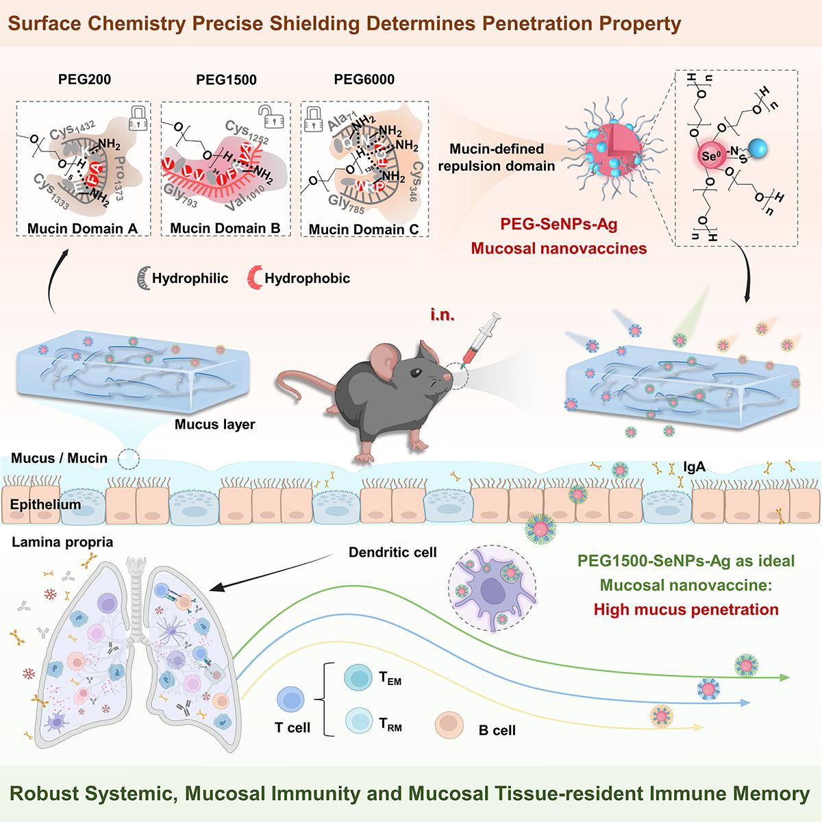 近日,化学与材料学院许利耕/陈填烽教授团队在针对呼吸道重大传染性疾病新型黏膜纳米疫苗开发方面取得重要进展,相关成果以“Mucin-defined repulsion domain inspiring precise PEGylation shielding empowers Selenium nanovaccines as universal mucosal ones against infections”为题发表于国际权威期刊Cell子刊Chem (影响因子19.6),暨南大学为唯一通讯单位。这是该团队继开发纳米硒佐剂用于新冠病毒纳米疫苗(STTT, 2023)、超级耐药菌创伤感染与组织修复(Drug Resistance Update, 2024)、灭活病毒纳米疫苗(Small Methods, 2023)、纳米疫苗精准免疫(ACS Nano, 2023)等一系列研究工作后取得的又一重要成果。