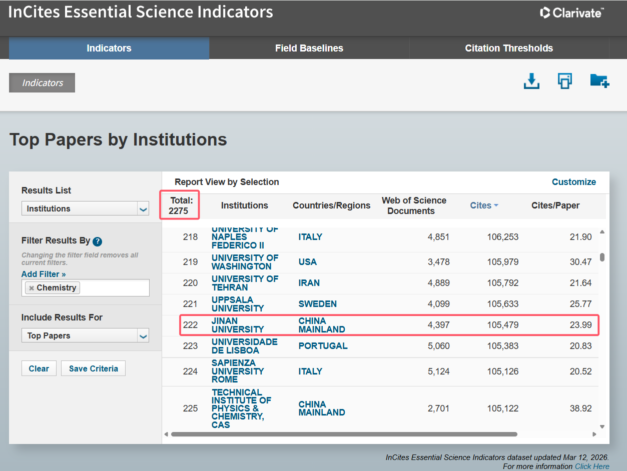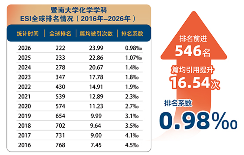 回顾发展历程,暨南大学化学学科于2012年进入ESI全球前1%。近年来,在全校相关专业师生的共同努力下,该学科实现了跨越式发展,目前排名第222位,排名系数0.98‰,篇均被引次数23.99次。上述数据充分体现了暨南大学化学学科学术影响力持续增强。这份成绩的取得,离不开学校的高度重视和大力支持、兄弟院系交叉学科的协同发展以及全体师生的共同奋斗。未来,暨南大学化学与材料学院将继续聚焦目标任务,注重拔尖创新人才培养,加强有组织科研,促进学科交叉融合,力争在学科建设中取得新成绩、实现新突破,为高质量发展作出新的更大贡献!