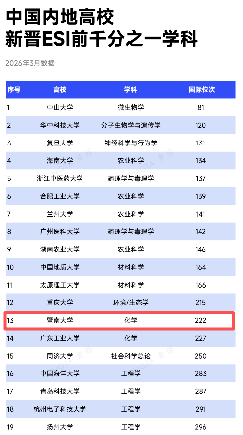 近日,科睿唯安(Clarivate)发布了基本科学指标数据库(Essential Science Indicators,简称ESI)最新统计数据。暨南大学化学与材料学院领建的化学学科首次进入ESI全球前1‰,成为暨南大学第5个进入ESI全球前1‰的学科。这标志着暨南大学化学学科在基础研究与高水平成果产出等方面已具备显著的国内外影响力。